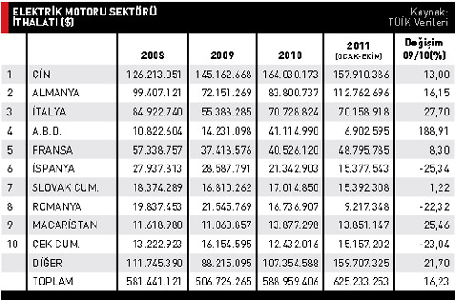 Ülkemizin elektrik motoru ithalatı, 2010 yılında 589 milyon dolar oldu. Yüzde 16 oranında artış yaşanan sektörün ithalatı 2009 yılında 507 milyon dolardı. Çin, Türkiye’nin elektrik motoru sektörü ithalatında birinci sırada yer alıyor. Söz konusu ülkeye 2011 yılının Ocak-Ekim döneminde 158 milyon dolarlık ithalat gerçekleşti. Çin’den 2009-2010 yılları arasında ithalat yüzde 13 oranında arttı.