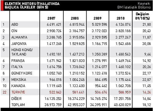 ardından 2010 yılında yüzde 9 oranındaki yükselişle 6 milyar dolar seviyesine yükseldi. Üçüncü ülke ise Japonya. Söz konusu ülke dünya elektrik motoru sektörü ihracatında yüzde 23 oranında yükselişle 3 milyar dolar oldu.