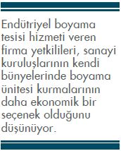 Endüstriyel boyama, imalatın son, satışın ise ilk basamağını oluşturan önemli bir alandır. Müşteriyi etkileme amacıyla ortaya çıkan boyama uygulamaları, aslında ürünün kalitesini ve piyasa değerini de artırıyor. Üretici açısından boyama tesislerinin çağdaş teknolojiyle yapılandırılması gereksiz zaman, insan gücü ve enerji kaybını engellediği gibi başta firmalar olmak üzere ülke ekonomisine ve tüketiciye kazanç sağlıyor.