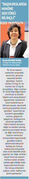 Ar-Ge ve tasarım merkezleri arasındaki temel farklarla ilgili bilgi veren Türkiye’nin Makinecileri Yönetim Kurulu Üyesi Sevda Kayhan Yılmaz, en temel farkın kişi sayısında ortaya çıktığını söylüyor. Yılmaz, “Tasarım merkezi 10 kişi, Ar-Ge merkezi ise 15 kişi ile kurulabiliyor. Ar-Ge’de bilgi dağarcığının artırılması ve üretilen bilginin yeni süreç/sistem/uygulamalar tasarlamak üzere kullanılması ve bilimsel esaslar, sistematik temel çerçevesinde olması gerekiyor. Tasarımda ise ürünlerin işlevselliğini artırma, geliştirme, iyileştirme, farklılaştırma yaratması gerekiyor. Tabii ki ikisinin de katma değer
