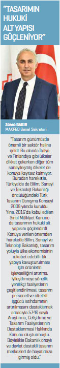 olduğu gibi tasarım konusunun hukuki alt yapısını güçlendirmiştir. Konuya verilen önemden hareketle Bilim, Sanayi ve Teknoloji Bakanlığı; özel sektörde, tasarım yoluyla ülke ekonomisinin uluslararası düzeyde rekabet edebilir bir yapıya kavuşturulması için ürün veya ürünlerin işlevselliğini artırma, geliştirme, iyileştirme ve farklılaştırmaya yönelik yenilikçi faaliyetlerin çoğaltılması, tasarım personeli ve nitelikli işgücü istihdamının artırılmasını desteklemek ve teşvik etmek amacıyla 5746 sayılı Araştırma, Geliştirme ve Tasarım Faaliyetlerinin Desteklenmesi Hakkında Kanun üzerinde gerekli düzenlemeleri gerçekleştirmiştir” diyen Zühtü Bakır, böylelikle Bakanlık onaylı ve devlet destekli tasarım merkezlerinin hayatımıza girdiğini vurguluyor.
