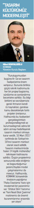 Makine imalat sektöründe, özellikle mermer makineleri imalatı alanında faaliyet gösteren KONMAK, kuruluşundan bugüne Ar-Ge ve tasarım faaliyetlerine önem veriyor. Uzun yıllardan bu yana gerek kendi öz kaynakları, gerekse kamu destekleriyle farklı projeler üreten KONMAK, 16 Mart 2017 tarihinde Türkiye’nin 18’inci tasarım merkezi olarak tescil edildi. KONMAK Tasarım Merkezi, aynı zamanda faaliyet gösterdiği Denizli’de makine imalat sektöründe açılan ilk tasarım merkezi unvanının da sahibi konumunda bulunuyor. KONMAK Yönetim Kurulu Başkanı Hilmi Konyalıoğlu, tasarım merkezi olarak akredite olmakla, Ar-Ge ve tasarıma bakış açılarını da farklı bir platforma taşıdıklarını söylerken, “Tasarım merkezinin yönetim sistemi, şekli ve sağladığı önemli teşviklerle çok sayıda kazanımımız oldu. Örneğin mühendis kadromuz her geçen gün genişlerken, tasarım merkezi olmanın verdiği yetkinlikle kamu destekli projelerin onay süreçleri kısaldı ve kolaylaştı; firmamızın yıllık bütçe planında bulunan Ar-Ge ve tasarım harcamalarına ayrılan bütçe arttı; fikri mülkiyet hakları konusundaki farkındalığımız yükseldi; proje izleme, değerlendirme, bilgilendirme, raporlam