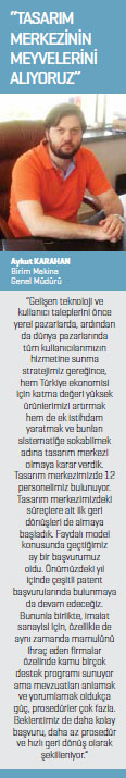 sokabilmek adına tasarım merkezi olmaya karar veren firmalardan biri. Birim Makina Genel Müdürü Aykut Karahan, ürettikleri makinelerin yüzde 60 ila yüzde 80 oranında ihracata konu olduğunu söylerken, Türkiye’nin 34’üncü tasarım merkezi olan Birim Makina Tasarım Merkezi ile devlet desteklerinden faydalanarak elde edecekleri faydayı yine imalat ve insan kaynağına yapacakları yatırımlara yansıtacaklarını; bu döngü ile yeni ve teknolojik ürünlerle makinelerin marjinal faydasını da artırarak imalat maliyetlerini düşürebileceklerini ifade ediyor.