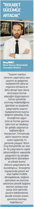 Norm Somun ise Ar-Ge ve tasarım çalışmaları eşliğinde uzun yıllardır faaliyetlerini yürüten bir firma. Norm Somun Mühendislik Hizmetleri Müdürü Burç Benli, geçtiğimiz yıl hayatımıza giren tasarım merkezi kavramının aslında Norm Somun faaliyetleri ile birebir örtüştüğünü ve bu nedenle hızla başvuru süreçlerini tamamlayarak Türkiye’nin 41’inci tasarım merkezi olarak akreditasyon almayı başardıklarını söylüyor.Tasarım merkezi olmanın, halen yaptıkları tasarım ve geliştirme faaliyetlerinin daha iyi organize olmasına ve daha detaylı kayıt altına alınmasına hizmet edeceğini ifade eden Benli, “Zaman içerisinde artırmayı hedeflediğimiz işbirlikleri ve akademik çalışmalarla tasarım faaliyetlerimizin katma değerini yükseltip, Grup stratejimize uygun ürün ve hizmet gamına daha hızlı ve rekabetçi bir şekilde ulaşmamızı sağlayacağına inanıyorum” değerlendirmesinde bulunuyor.