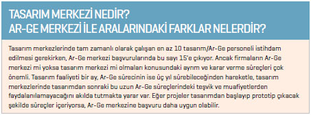 süreçlerinde sıkıntı yaşayabilir. Bu kapsamda, tasarım merkezleri içinde Ar-Ge projelerinin gösterilemeyeceğini; bir işin tasarım kısmının bir ay Ar-Ge sürecinin üç yıl sürebileceğinden hareketle, tasarım merkezlerinde tasarımdan sonraki bu uzun Ar-Ge süreçlerindeki teşvik ve muafiyetlerden faydalanılamayacağını akılda tutmakta yarar var. Eğer projeler tasarımdan başlayıp prototip çıkacak şekilde süreçler içeriyorsa, Ar-Ge merkezine başvuru daha uygun olabilir.