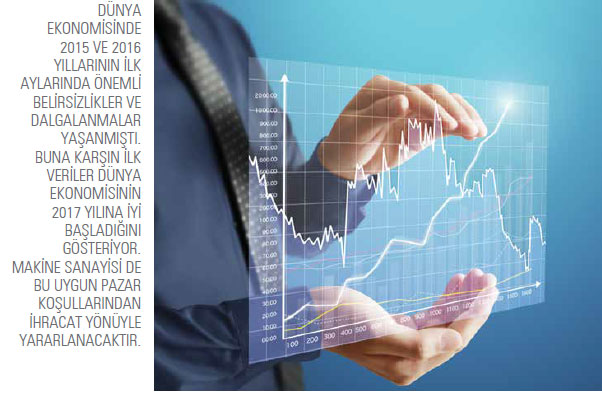 2015 ve 2016 yıllarının ilk aylarında küresel mali piyasalarda önemli dalgalanmalar yaşanmıştı. Geçen yıl FED faiz artışı korkusu ve Çin’de yavaşlama endişesiyle mali piyasalarda sert dalgalanmalar olmuştu. 2017 yılına ise küresel mali piyasalar oldukça sakin başladı. FED faiz artışı beklentileri daha makul karşılanıyor. Buna bağlı sert sermaye kaçışları yaşanmıyor. Para birimleri arasındaki dalgalanmalar da azaldı. Mali piyasalarda dalgalanmaların azalması reel sektör yatırımları içinde daha uygun koşullar ve finansman olanakları yaratıyor. Dünya Ticaret Örgütü de 2016 yılının ikinci yarısından itibaren yeni geliştirdiği öncü göstergeleri açıklıyor. En son Aralık 2016’da yayınlanan öncü göstergeler küresel ölçekte ithalat siparişlerinin arttığına işaret ediyor. Taşımacılık navlun endeksleri halen zayıf olmakla birlikte geçen yıllardaki Ocak ayı seviyelerinin üzerinde. Bu çerçevede küresel ticarette de iki yılın ardından yeniden büyüme işaretleri alınıyor. Yakın ve komşu pazarlarımızdaki ekonomik koşullar da iyileşmeye başladı. Enerji ve emtia fiyatlarındaki artış özellikle enerji ihracatçısı ülkelerde ekonomik büyümeleri hızlandıracak. Bu pazarlarda yaşanan ekonomik yavaşlama nedeniyle yatırımlar son iki yıldır ötelenmişti. 2017 yılından itibaren yatırımların yeniden hareketlenmesi bekleniyor. Bu durum da makine ihracatımızı olumlu yönde etkileyecektir.
