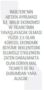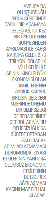 Avrupa Birliği ekonomisi küresel kriz sonrası uzun süren resesyonun ardından son iki yıldır kademeli, ancak kırılgan bir ekonomik toparlanma içine girmişti. AB ve Euro Bölgesi ekonomileri yüzde 1,5-2,0 arasında bir büyüme temposuna yaklaşmaktaydı. İngiltere’nin ayrılık kararı ile birlikte Birliğin siyasi geleceğine ilişkin ortaya çıkan belirsizlik ekonomik toparlanma ve büyümeyi de olumsuz etkileyecektir. Yılın ikinci yarısında ve 2017 yılında AB ve Euro Bölgesi’nde daha yavaş bir ekonomik büyüme gerçekleşecektir. İspanya, İtalya, Portekiz ve Yunanistan gibi ülkelerin ekonomik sorunları yeniden artabilecektir. Avrupa Parasal Birliği ve Euro da tartışma konusu olacaktır ve muhtemelen Euro önümüzdeki iki yıl içinde zayıf kalacaktı