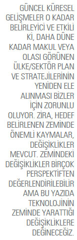 Yukarıda belirtilen teknoloji ve alt başlıkları tabii ki sadece kendi alanlarında gelişmiyor. Bu altı alanın birbiri ile irtibatlandırılması, değişik düzlemlerde entegrasyonu ile de yeni alanlar, yenilikler meydana getiriyor. Dolayısı ile önümüzdeki 5-10 sene içinde bu alanların farklılaşmış yeni yüzleri ile karşı karşıya geleceğiz. Türkiye’de bu alanların hangisinde çalışmalar mevcut? Bu soruya verilecek yanıt makasın ne kadar açıldığının da işareti olacaktır. Buna karşılık kamunun, yarı kamu ve kuruluşlarının ve de tabii ki işletmelerin neler yapılması gerektiği konusu da gelecek yazının içeriğini oluşturacak.
