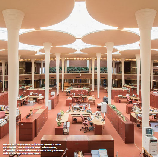 Çelik yapı teknolojisinin inşaat dünyasına katkısıyla yeni tasarlanan gökdelenler ise bu insanlık dışı şartların bir dönem için yavaş yavaş düzelmesine vesile olacaktı. Bu değişimin en belirgin örneği, kült mimar Frank Lloyd Wright’ın inşaatı 1936 yılında başlayan “The Johnson Wax” binasında görülür: Yatay yapı olarak mimarisi de hayli iddialı binada, tek katta açık plan 200 çalışan olmasına rağmen, tanımlı bir mimari dekorla üretkenliği destekleyen aydınlık bir ortam içerisinde, huzurlu çalışma alanı yaratılmıştı. Wright, böylece, daha sonra gelişecek ofis alanlarının kurumsal kimliğini oluşturacak yeni bir tasarım dalının da önünü açmış oldu. Yurttaşlık ve kadınların temel hak hareketleriyle birlikte, değişen çalışma tarzında artık iletişim de gerekliydi. 1960’larda ofis alanları değişimi daha sosyal bir tasarım mantığıyla yeniden aktive olurken, Burolandschaft akımı, ekiplerin yarı açık alanlarda bir araya geldiği, kadınların iş hayatına katıldığı bir dönemde, mekânda bitkilerin de önemli rol oynadığı informal ve paylaşımlı bölümlemelerden oluşuyordu.