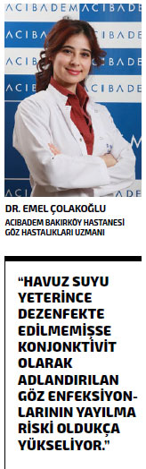 Hijyenik olmayan havuz suları gözler açısından önemli bir risk kaynağı. Havuzların büyük çoğunluğu klor, PH düşürücü veya PH yükseltici ve yosun öldürücü gibi kimyasal maddelerle dezenfekte ediliyor. Kullanılan bu maddelerin etkinliği uygulama yöntemi ve sıklığına göre değişiyor. Havuz suyu yeterince dezenfekte edilmemişse konjonktivit olarak adlandırılan göz enfeksiyonlarının yayılma riski oldukça yükseliyor. Bu nedenle denetimlerin yapıldığından ve uygun şekilde temizlendiğinden emin olmadığınız havuzlara girmeyin.