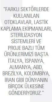 “İhracat Odaklı Bir Firmayız ” İhracat odaklı bir firma olarak ürünlerinin yaklaşık yüzde 50’sini ihraç ettiklerini vurgulayan Muhittin Ak, “Birçok sektörde kullanılan otoklavlar, lastik kaplama ekipmanları, sterilizasyon sistemleri ve proje bazlı tüm ürünlerimizi İtalya, İspanya, Almanya gibi Avrupa ülkeleriyle ABD, Tayland, Brezilya, Kolombiya, İran gibi birçok ülke ve bölgeye gönderiyoruz. 2014 yılını 2013’e göre yüzde 20 büyüyerek kapattık. Gelecek yıl ise yüzde 20-25 oranında bir büyüme hedefliyoruz. Önümüzdeki yıl satış ve pazarlama faaliyetlerinin geri dönüşlerinin yoğun olacağı düşüncesi ile kapasite artışı için de yeni yatırımlar planlıyoruz” dedi.