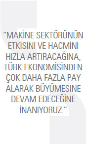 Türkiye makine üreticiliği bakımından sizce ne durumda? Ülkemiz bu konuda ne yazık ki olması gereken düzeyde değil. Geçmişte yaşanan istikrarsızlıklar ve devletin sektörle alakalı teşvik edici herhangi bir adım atmaması sebebiyle gelişmeler istenen düzeyde olmadı. Firma olarak Türk makine sektörünün çok büyük potansiyeli olduğuna inanıyoruz. Türkiye’nin kendisine örnek alabileceği gelişmiş ve gelişmekte olan ülkelerdeki makine sektörünün ekonomiden aldığı paya bakınca, söz konusu potansiyeli görmek hiç de zor olamayacaktır.