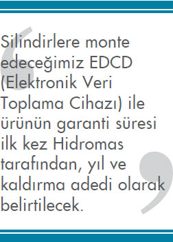 Firmalarının sürekli gelişim içerisinde olduğunun altını çizen Hidromas Pazarlama Müdürü Mustafa Özkavak; “10 kişiden oluşan bir Ar-Ge birimine sahibiz. Firmamız her yıl en az iki yeni ürün geliştirme prensibiyle çalışıyor. Bu yıl da müşterilerimizin hizmetine iki yeni ürün sunacağız. Bu ürünlerden ilki; haberlerde sık sık karşılaştığımız “damperli araç köprüde asılı kaldı!” ve “damperli araç köprüyü uçurdu!” gibi olumsuzlukların önüne geçerek, bu kazalara neden olan “kapalı devre valf” sisteminin yerini alacak olan “’hızlı yavaş indirme sistemi üzerinde açık devre valf” sistemidir. Diğer yeni ürünümüz ise patenti de firmamıza ait olan EDCD’dir. Silindirlere monte edeceğimiz bu EDCD yani “elektronik veri toplama cihazı” ile ürünün garanti süresi üstyapı sektöründe ilk kez Hidromas tarafından, yıl ve kaldırma adedi olarak belirtilecek. Bu ürünle hidrolik sistemin çalışmaya başlamasından itibaren; hangi tarihlerde kaç sefer yaptığı, üzerindeki yükün miktarı, sistemin çalışma basıncı gibi bilgiler toplanabilinecek. Böylelikle garanti süresi konusunda son tüketici ile müşterimiz arasında yaşanabilecek olası anlaşmazlıklar da ortadan kaldırılmış olacak.