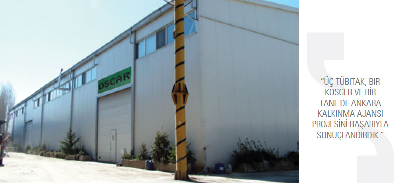 Hafif inşaat makineleri başlığı altında kesme, hafif perdah, masa tipi kesici ve beton silme ve parlatma makineleri olmak üzere 2015 yılında dört yeni ürünü pazara sunduklarını söyleyen Oscar Makine Genel Müdürü Aydın Cömert, “Yeni geliştirdiğimiz modüler çok amaçlı elektrikli aracımız sekiz kişi kapasiteli misafir-turist gezdirme amacına uygun olmanın yanında; düz kasa kamyonet, yarım kasa yük taşıyıcı, ambalaj atıkları toplama aracı, panelvan, ambulans ve damperli araç işlevini görecek şekilde tasarlanmıştır. Bu aracımız birkaç dakikada kullanma amacına uygun hale getirilebilen bir platforma sahiptir. İleri dönüşüm alanındaysa yongadan biokütle yakıt, peyzaj dekorasyon ve toprak rehabilitasyonu için de natürel ve renkli yonga olmak üzere iki yeni ürün geliştirdik” dedi. Son üç yıl içinde üç TÜBİTAK, bir KOSGEB ve bir tane de Ankara Kalkınma Ajansı projesini başarıyla sonuçlandırdıklarını belirten Cömert, sözlerini şöyle sürdürdü: “Ayrıca devam eden üç projemiz