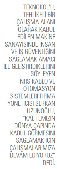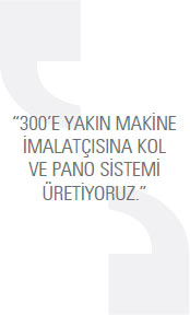 İhracat çalışmalarına ilk olarak Almanya ile başladıklarını belirten NRS Kablo ve Otomasyon Sistemleri Firma Yöneticisi Serkan Uzunoğlu, “Polonya, İngiltere, Portekiz, Holanda, Danimarka, Çin, Kanada ve Brezilya’dan firmalarla da ön anlaşmaları yaparak numune ürünlerimizi gönderdik. Distribütörlük çalışmalarımız hızla devam ediyor. Üretim hattımız gelen siparişe göre seri montaj yapabilmeye uygun olarak tasarlandı. Yurt içinde 300’e yakın makine üreticisi firmaya kol ve pano sistemi üretiyor, termin sıkıntımız olmadığı için de taleplere anında cevap verebiliyoruz. Günlük ortalama 150 adet panonun montajını yapabiliyoruz. Operatör kollarımız ise demonte olarak raflarımızda, her modelden ve minimum 1000 takımlık stok olarak mevcut durumda” dedi.