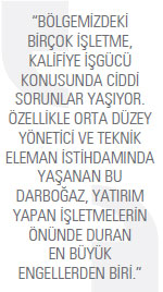 Bölgemizdeki tüm işletmeler, kalifiye işgücü konusunda ciddi sorunlar yaşıyor. Özellikle orta düzey yönetici (departman yöneticisi) ve teknik eleman (teknisyen, tekniker, operatör, vb) istihdamında yaşanan bu darboğaz, yatırım yapan işletmelerin önündeki en büyük engellerden biri. Bölgemizdeki işgücünün niteliğini geliştirmek amacıyla mesleki eğitimlerin içerik ve kapsamı geliştirilmelidir. Endüstri meslek liseleri, teknik liseler, meslek yüksekokulları ve üniversitelerin mühendislik eğitimi veren branşlarında, sanayiye daha çabuk entegre olabilecek, teorik bilgi yanında el becerisi ve yetkinliği yüksek işgücü için, işletmelerde daha fazla zaman geçirilecek şekilde eğitimler planlanmalıdır. Ülkemizde ve bölgemizde değişen jeostratejik dengelerin önümüzdeki en büyük problem olduğunu düşünüyorum. Ayrıca sektörde aranan ve ihalelerde de gerek şart olarak istenen bir takım sertifikasyonlar (Tip Testler, TÜV Belgeleri, TSE Standartları vb.) ciddi maliyetlere neden oluyor. Bu tür sertifikasyonların temininde daha uygun şartların sağlanması rekabet açısından avantaj sağlayacağı gibi, ilk yatırımlar sonrasındaki iş bitirme yeterliliğine de sahip olmak açısından önem taşıyor. İşletmelere sağlanan finansal destek ve krediler çeşitlendirilmeli ve bu teşviklerdeki prosedürler basitleştirilmelidir. Devletin işletmelere sağladığı Ar-Ge destekleri çeşitlendirilerek desteklenmeli, yenilikler ve yenilikçi fikirler cazip hale getirilmelidir.