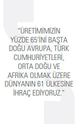 Üretimimizin yüzde 65’ini başta Doğu Avrupa, Türk Cumhuriyetleri, Orta Doğu ve Afrika’dakiler olmak üzere dünyanın 61 ülkesine ihraç ediyoruz. Ürün gamımızı oluşturan her kalemde ihracatımız mevcut.