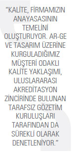 İhracat bazlı çalışan bir firma olarak kalite konusunda taviz verme lüksümüz asla olamaz. Kalite firmamızın anayasasının temelini oluşturuyor. Ar-Ge ve tasarım üzerine kurguladığımız müşteri odaklı kalite yaklaşımı, uluslararası akreditasyon zincirinde bulunan tarafsız gözetim kuruluşlarınca da sürekli olarak denetleniyor. Bu çerçevede de TSE, CE, ISO 9001, OHSAS 18001, ISO 14001, Ghost ve Tip Test standartlarını hayata geçirdik.