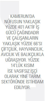 Kamerun’da nüfusun yaklaşık yüzde 40’ı aktif iş gücü çağındadır ve çalışanların yaklaşık yüzde 66’sı çiftçilik, hayvancılık, avcılık ve balıkçılıkla uğraşıyor. Yüzde 14’lük kısım ise vasıfsız işçi olarak yine tarım sektöründe istihdam ediliyor. Çalışanların yüzde 57’si kendi hesabına çalışırken ancak yüzde 20’si ücretli olarak, yüzde 20’si ise ailesine yardımcı olarak çalışıyor