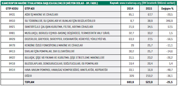 Kamerun, 84. fasılda 2015 yılı verilerine göre en fazla 8431 GTİP kodlu “Ağır iş makine ve cihazları” ürün grubunda ithalat yaptı. 2015 yılında söz konusu ürün grubunda 67,9 milyon dolarlık ithalat gerçekleştirilirken, bu rakam 2014 yılında 85 milyon dolar seviyesinde gerçekleşmişti. Listenin ikinci sırasında 8410 GTİP kodlu “Su türbinleri, su çarkları ve bunlar için regülatörler” ürün grubu bulunuyor. Kamerun, 2015 yılında söz konusu kalemde 38,9 milyon dolar değerinde makine ithal ederken, bu ürün grubuna ait 2015 yılı verilerinde yüzde 347’ye ulaşan artış gerçekleştirildiği izleniyor. Bu ürün grubu, aynı zamanda, Kamerun’un makine ithalatında en fazla artış görülen ürün grubu olması açısından da önem taşıyor. Kamerun’un 84. fasılda en fazla ithalat gerçekleştirdiği üçüncü kalem ise 8421 GTİP kodlu “Santrifüjle çalışan kurutma, filtre, artıma cihazları” ürün grubu oldu. 2014 yılında söz konusu ürün grubunda 21,9 milyon dolarlık ithalat