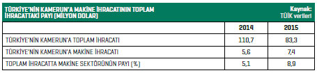 Türkiye ise Kamerun’un makine ithalatında 2015 yılında 20’nci sırada yer aldı. TÜİK verilerine göre, Türkiyeli makine üreticileri, 2015 yılında yüzde 31,6 ihracat artışı yakaladı ve Kamerun’a 7,4 milyon dolar değerinde makine ihraç etti.
