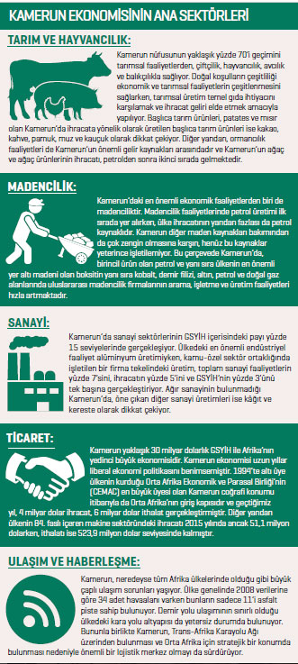 Kamerun, 30 milyar dolarlık GSYİH ile Afrika’nın yedinci, Orta Afrika’nın ise en büyük ekonomilerinden biri olarak gösteriliyor. Coğrafi konumu itibarıyla Orta Afrika’nın giriş kapısı ve 1994’te kurulan altı üyeli Orta Afrika Ekonomik ve Parasal Birliği’nin (CEMAC) en büyük ülkesi olan Kamerun, yükselen bir ekonomik grafik izliyor olsa da uzun yıllar süren sömürü döneminin yarattığı geri kalmışlığı telafi edebilmek ve 2035 yılı için hedeflediği gelişmişlik seviyesine ulaşabilmek için de var gücüyle çalışıyor. Ekonomi Bakanlığı ve Uluslararası Para Fonu (IMF) verilerine göre yüzde 5 seviyelerinde gerçekleşen bir büyüme sergileyen Kamerun, bu doğrultuda şehir planlaması, sağlık sektörü, tarım ve hayvancılık, yollar, enerji, su ve güvenlik olmak üzere yedi ana temel bölümden oluşan bir acil eylem planını üzerine odaklanmış durumda.