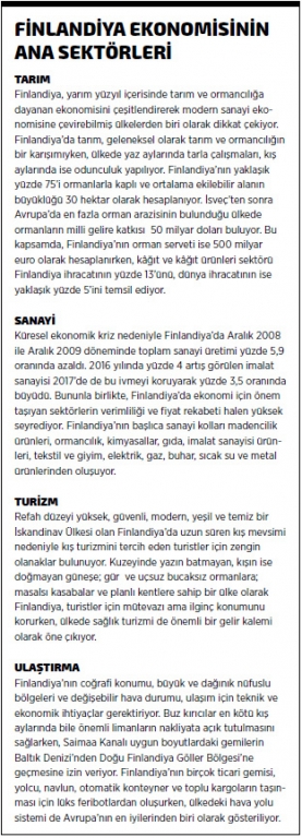 Finlandiya’nın sanayi altyapısının oluşmasına, İkinci Dünya Savaşı ertesinde Rusya ile yapılan barış anlaşması çerçevesinde savaş tazminatının gemi ile makine-ekipman olarak ödenme mecburiyeti önemli bir katkıda bulundu. Metal ve mühendislik sanayisinin ham maddesi demirin ve sanayi için gerekli enerji kaynağı petrolün Rusya’dan temini, buna karşılık söz konusu ülkeyle yapılan uzun vadeli ticari ve ekonomik iş birliği anlaşmalarıyla sanayi üretiminin bu ülkeye satışı ve üretim fazlasının da diğer Batı ülkelerine pazarlanması, sanayi altyapısının etkin kullanımını sağladı. Finlandiya, bugün büyük ölçüde endüstrileşmiş bir serbest piyasa ekonomisine sahipken 2017 yılında 252 milyar dolara ulaşan GSYİH’siyle Avusturya, Belçika, Hollanda ve İsveç’le benzer bir büyüklüğe sahip bulunuyor. Ekonomide ve özellikle imalat sanayisinde (ormancılık, metal işleme, tasarım/dizayn, telekomünikasyon ve elektronik) son derece rekabetçi sektörler barındıran ülkede, iklim koşulları nedeniyle tarımda sadece kendine yeterlilik hedefleniyor. Ormancılıkla ilgili sektörler ise özellikle kırsal kesimde en büyük ikinci uğraş dalını oluşturuyor.