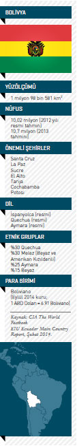 Güney Amerika’nın ortasında yer alan ve denize kıyısı olmayan Bolivya, Brezilya, Arjantin, Paraguay, Şili ve Peru ile komşudur. Ülkenin ulusal kahramanı olarak büyük saygı gören Simon Bolivar, 1825 yılında İspanya’nın egemenliğine son vererek Bolivya’ya bağımsızlığını kazandırdı. Ülkede kurumsal anlamıyla demokratik sistem 1982 yılında uygulanmaya başladı. Bolivya; Beni, Chuquisaca, Cochabamba, La Paz, Oruro, Pando, Potosi, Santa Cruz ve Tarija olmak üzere dokuz idari eyaletten oluşur. Ülkede devlet başkanı ve başkan yardımcısı, beş yıllık bir dönem için halk tarafından ya da meclis tarafından seçiliyor. Bolivya’da Ocak 2009’da oylamaya sunularak kabul edilen yeni anayasa ile ekonomik gelişimde devletin üstlendiği rol artırıldı. Yaklaşık 10,5 milyon nüfusa sahip olan Bolivya’da uzun zamandır hızlı bir nüfus artışı gözleniyor. 1980’li yıllarda 5,4 milyon olan toplam nüfusun 2020 yılında 11,6 milyona ulaşacağı öngörülüyor. Yaş ortala