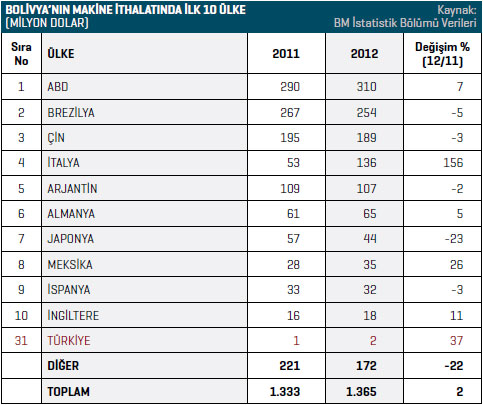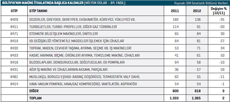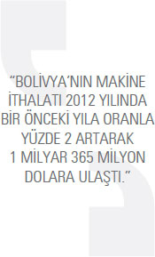Bolivya’nın makine ithalatı 2012 yılında bir önceki yıla oranla yüzde 2 artarak 1 milyar 365 milyon dolar olarak kaydedildi. 2011 yılında bu rakam 1 milyar 333 milyon dolar seviyesindeydi. 2012 yılı rakamlarına göre Bolivya’nın en fazla makine ithal ettiği ilk 10 ülke listesinin ilk sırasında ABD bulunuyor. ABD’den 2011 yılında 290 milyon dolar değerinde makine ithal eden Bolivya’nın 2012 yılı makine ithalatı yüzde 7 artarak 310 milyon dolar olarak kaydedildi. Bolivya 2012 yılında listenin ikinci sırasında bulunan Brezilya’dan 254 milyon dolar değerinde makine ithal etti. 2011 yılında bu rakam 267 milyon dolar seviyesindeydi. 2012 yılında Bolivya’nın Brezilya’dan makine ithalatı yüzde 5 azaldı. Bolivya’nın 2012 yılında en fazla makine ithal ettiği ilk 10 ülke listesinin üçüncü sırasında ise Çin yer alıyor. Bolivya, 2011 yılında Çin’den 195 milyon dolar değerinde makine ithal ederken bu rakam, 2012 yılında yüzde 3 azalarak 189 milyon dolar olarak kaydedildi. Bolivya’nın 2012 yılında bir önceki yıla oranla makine ithalatını en fazla artırdığı ülke yüzde 156 ile İtalya oldu. İtalya’dan 2011 yılında 53 milyon dolar değerinde makine ithal edilirken bu rakam 2012 yılında, 136 milyon dolar seviyesine yükseldi. Bolivya 2012 yılında en fazla dozerler, greyder, skreyper, ekskavatör, küreyici, yükleyici- içi vb. kaleminde ürün ithal etti. 2011 yılında söz konusu ürün grubunda 182 milyon dolarlık ithalat gerçekleştirilirken bu rakam, 2012 yılında yüzde 25 azalarak 136 milyon dolar olarak kayda geçti. Listenin ikinci sırasında turbojetler, turbo-propeller, diğer gaz türbinleri bulunuyor. Bolivya 2012 yılında söz konusu kalemde 91 milyon dolar değerinde makine ithal etti. 2011 yılında bu rakam 114 milyon dolardı. Söz konusu kalemde Bolivya’nın ithalatı yüzde 20 azaldı. En fazla ithalat gerçekleştirilen üçüncü kalem otomatik bilgi işlem makineleri, üniteleri oldu. 2011 yılında söz konusu kalemde 65 milyon dolarlık ithalat gerçekleştirilirken bu rakam, 2012 yılında yüzde 30 artarak 84 milyon dolar seviyesine yükseldi. Bolivya’nın makine ithalatında en fazla artış yüzde 59 ile ağır iş makine ve cihazlarının aksamı, parçaları kaleminde gerçekleşti. Söz konusu ürün grubunda 2011 yılında 36 milyon dolarlık ithalat gerçekleştirilirken bu rakam, 2012 yılında 57 milyon dolar seviyesine yükseldi.
