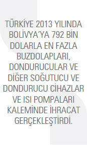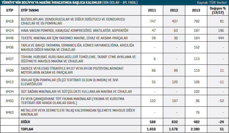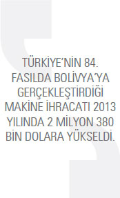 Türkiye’nin 84. fasılda Bolivya’ya gerçekleştirdiği makine ihracatı 2013 yılında 2 milyon 380 bin dolara yükseldi. 2012 yılında bu rakam 1 milyon 578 bin dolar seviyesindeydi. Bolivya’ya yönelik makine ihracatındaki artış yüzde 51 oldu. Türkiye 2013 yılında 792 bin dolarla en fazla buzdolapları, dondurucular ve diğer soğutucu ve dondurucu cihazlar ve ısı pompaları kaleminde ihracat gerçekleştirdi. Söz konusu kalemde 2012 yılında Türkiye’nin ihracatı 437 bin dolardı. Bolivya’ya yönelik buzdolapları, dondurucular ve diğer soğutucu ve dondurucu cihazlar ve ısı pompaları ürün grubundaki ihracat 2013 yılında yüzde 81 arttı. Listenin ikinci sırasında bulunan hava-vakum pompası, hava/gaz kompresörü, vantilatör, aspiratör kaleminde, 2012 yılında 63 bin dolarlık ihracat gerçekleştirilirken bu rakam 2013 yılında yüzde 196 artarak 187 bin dolar seviyesine yükseldi. Türkiye’nin Bolivya’ya yönelik makine ihracatının üçüncü sırasında tekstil makineleri için yardımcı makine, cihaz ve aksam- parçaları mal grubu yer alıyor. 2013 yılında söz konusu kalemde gerçekleştirilen ihracatın değeri 164 bin dolar oldu. 2012 yılında bu rakam 30 bin dolar seviyesindeydi. 2013 yılında Türkiye’nin Bolivya’ya yönelik makine ihracatında en fazla artış yüzde 444 ile tekstil makineleri için yardımcı makine, cihaz ve aksam- parçaları kaleminde gerçekleşti.