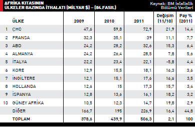 Afrika ülkelerinin makine ve aksamları ithalatındabirinci sırada yer alan Çin’den sonra sıralamayı 6,3 oranında artışla Almanya takip etti. Afrika ülkeleri Almanya’dan 6 milyar 813 milyon dolar değerinde ithalat gerçekleştirdi. İtalya ve Fransa’nın ise pazar payını kaybettiği görülüyor. İtalya 2010 yılına göreyüzde 4,6 oranında, Fransa ise yüzde 0,5 oranında azalış kaydetti.