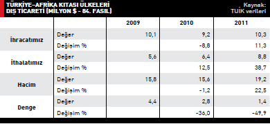 Ülkemizle Afrika ülkeleri arasındaki 2011 yılı dış ticaret dengesi bir önceki yıla göre yüzde 49,9 oranında azaldı.2011 yılında iki ülke arasındaki dış ticaret hacmi 2010 yılına göre yüzde 22,5 oranında artarak 19 milyar dolar değerinde kaydedildi.