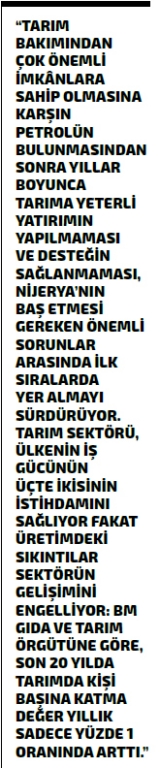 Diğer yandan, tarım bakımından da çok önemli imkânlara sahip olmasına karşın petrolün bulunmasından sonra yıllar boyunca tarıma yeterli yatırımın yapılmaması ve desteğin sağlanmaması da Nijerya’nın baş etmesi gereken önemli sorunlar arasında ilk sıralarda yer almayı sürdürüyor.