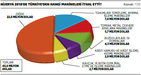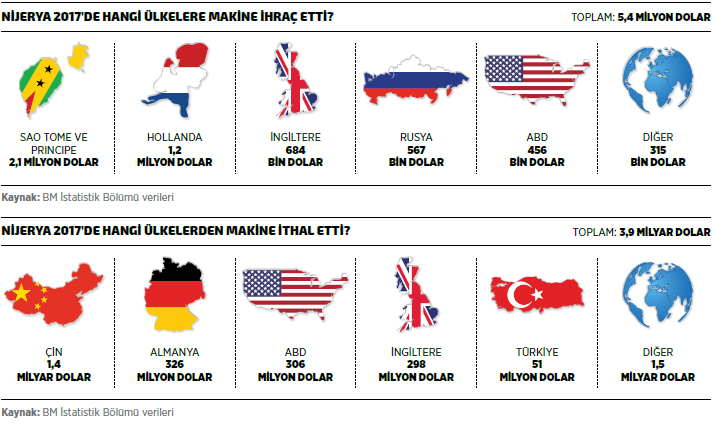 Bununla birlikte, makine ithalatı Nijerya ekonomisinde önemli bir gider kalemi olmaya devam ediyor. BM İstatistik Bölümü verilerine göre Nijerya’nın makine ithalatı 2017’de yüzde 36,5 azalışla 3,9 milyar dolar seviyesinde gerçekleşti. 2017 yılı verilerine göre Nijerya’nın en fazla makine ithal ettiği ilk 10 ülke listesinin ilk sırasında 1,4 milyar dolarla Çin yer alırken, listenin ikinci sırasında bulunan Almanya’dan 326 milyon dolar değerinde makine ithal edildi. Listesinin üçüncü sırasındaki ABD’den 2017’de ithal edilen makinelerin değeri ise 306 milyon dolar oldu. Nijerya 2017’de listenin dördüncü sırasındaki İngiltere’den 298 milyon dolarlık makine ithal ederken, beşinci sıradaki İtalya’dan da 252 milyon dolarlık ithalat gerçekleştirdi. Türkiye ise Nijerya’nın makine ithalatında, BM İstatistik Bölümü verilerine göre 51 milyon dolarla 11’inci sırada yer alırken, Türkiye’nin Nijerya’ya makine ihracatının bu dönemde yüzde 21,6 artış gösterdiği görülüyor.