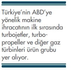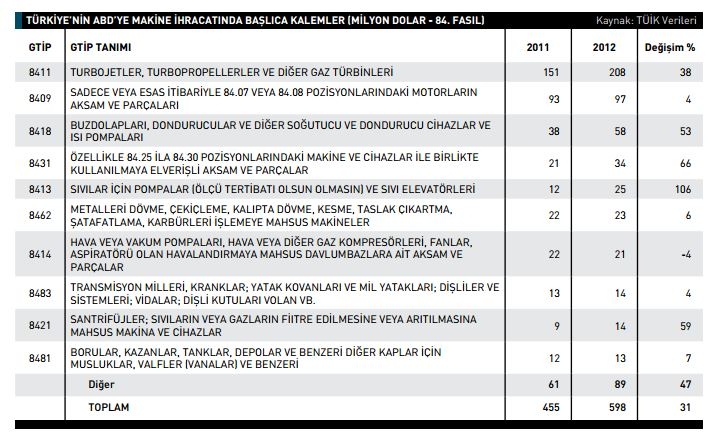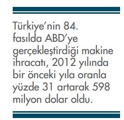 Türkiye’nin 84. fasılda ABD’ye gerçekleştirdiği makine ihracatı, 2012 yılında bir önceki yıla oranla yüzde 31 artarak 598 milyon dolar oldu. 2011 yılında ABD’ye yönelik ihracatın değeri 455 milyon dolardı. Türkiye’nin ABD’ye yönelik makine ihracatının ilk sırasında turbojetler, turbo-propeller ve diğer gaz türbinleri ürün grubu yer alıyor. 2011 yılında söz konusu ürün grubunda ABD’ye 151 milyon dolar değerinde ürün ihraç edilirken bu rakam 2012 yılında, yüzde 38 artışla 208 milyon dolar seviyesine yükseldi. Listenin ikinci sırasında bulunan sadece veya esas itibariyle 84.07 veya 84.08 pozisyonlarındaki motorların aksam ve parçaları mal grubunda, 2012 yılında gerçekleştirilen ihracatın değeri 97 milyon dolar olarak kaydedildi. Türkiye’nin ABD’ye makine ihracatında ilk 10 ürün listesinin üçüncü sırasındaki buzdolapları, dondurucular ve diğer soğutucu ve dondurucu cihazlar ve ısı pompaları kaleminde 2011 yılında 38 milyon dolarlık ihracat gerçekleştirilirken bu rakam 2012 yılında yüzde 53 artışla 58 milyon dolar seviyesine yükseldi. Listenin dördüncü sırasında yer alan; özellikle 84.25 ila 84.30 pozisyonlarındaki makine ve cihazlar ile birlikte kullanılmaya elverişli aksam ve parçalar kaleminde Türkiye’nin ABD’ye ihraç ettiği ürünlerin değeri 34 milyon dolar oldu. Beşinci sıradaki sıvılar için pompalar (ölçü tertibatı olsun olmasın) ve sıvı elevatörleri kaleminde ABD’ye ihraç edilen ürünlerin değeri 25 milyon dolar olarak kaydedildi. 2012 yılında Türkiye’nin ABD’ye yönelik makine ihracatında en fazla artış yüzde 106 ile sıvılar için pompalar (ölçü tertibatı olsun olmasın) ve sıvı elevatörleri ürün grubunda gerçekleşti.