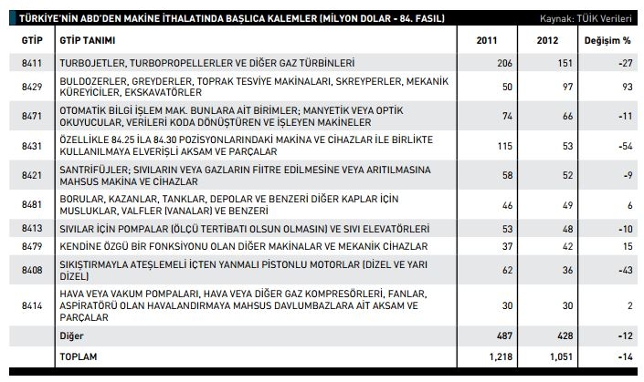 84. fasıl itibariyle 2012 yılında Türkiye’nin ABD’den en fazla ithal ettiği ürün grubu turbojetler, turbopropeller ve diğer gaz türbinleri oldu.Söz konusu ürün grubunda 2011 yılında 206 milyon dolarlık ithalat gerçekleştirilirken bu rakam yüzde 27 azalarak 2012 yılında 151 milyon dolar seviyesine geriledi. Listenin ikinci sırasında yer alan buldozerler, greyderler, toprak tesviye makineleri, skreyperler, mekanik küreyiciler, ekskavatörler kaleminde 2012 yılında 97 milyon dolarlık ithalat gerçekleştirildi. 2011 yılında söz konusu ürün grubundaki ithalatın tutarı 50 milyon dolardı. Türkiye’nin ABD’den makine ithalatında ilk 10 ürün listesinin üçüncü sırasında yer alan otomatik bilgi işlem makineleri bunlara ait birimler; manyetik veya optik okuyucular, verileri koda dönüştüren ve işleyen makineler ürün grubunda 2012 yılında 66 milyon dolarlık ithalat yapıldı. Listenin dördüncü sırasındaki; özellikle 84.25 ila 84.30 pozisyonlarındaki makine ve cihazlar ile birlikte kullanılmaya elverişli aksam ve parçalar kaleminde 2011 yılında 115 milyon dolarlık ürün ithal edilirken bu rakam 2012 yılında yüzde 54 azalarak 53 milyon dolar oldu. Beşinci sıradaki santrifüjler; sıvıların veya gazların filtre edilmesine veya arıtılmasına mahsus makine ve cihazlar ürün grubu ithalatı 2012 yılında 52 milyon dolar olarak kaydedildi. Türkiye’nin 2012 yılında ABD’den ithalatındaki en fazla artış yüzde 93 ile buldozerler, greyderler, toprak tesviye makineleri, skreyperler, mekanik küreyiciler, ekskavatörler kaleminde gerçekleşti.Türkiye’nin ABD’den makine ithalatı  2011 yılında 1,2 milyar dolarken bu rakam, 2012 yılında yüzde 14 azalarak 1 milyar dolar olarak kaydedildi.