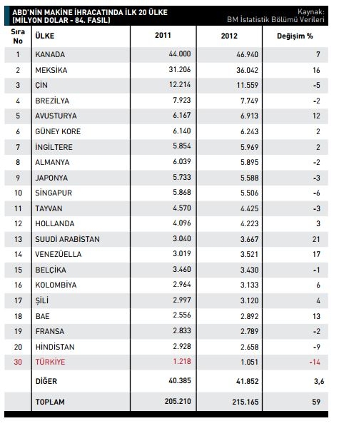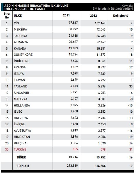 yüzde 102,1 milyar dolarla Çin yer alıyor. ABD’nin Çin’den gerçekleştirdiği ithalat, bir önceki yıla oranla yüzde 4 arttı. Listenin ikinci sırasında bulunan Meksika’dan 2011 yılında 38,7 milyar dolarlık makine ithal edilirken bu rakam yüzde 10 artışla 2012 yılında 42,5 milyar dolar seviyesine yükseldi. ABD’nin en fazla ithalat gerçekleştirdiği ülkeler listesinin üçüncü sırasında ise Japonya yer alıyor. ABD 2012 yılında Japonya’dan, bir önceki yıla oranla yüzde 9 artışla, 34,9 milyar dolar değerinde ürün ithal etti. 2011 yılında bu  rakam 31,9 milyar dolar seviyesindeydi. ABD’nin 2012 yılında, 2011 yılına oranla makine ithalatını en fazla artırdığı ülke Tayland oldu. Tayland’dan, 2011 yılında 4,4 milyar dolarlık makine ithal edilirken bu rakam 2012 yılında yüzde 33 artışla 5,8 milyar dolar değerine yükseldi. ABD’nin makine ithalatında 30. sırada bulunan Türkiye, ABD’ye 2011 yılında 455 milyon dolarlık makine gönderirken bu rakam yüzde 31 artışla 2012 yılında 598 milyon dolar seviyesine yükseldi. ABD 84. fasılda 2012 yılı itibarıyla en fazla otomatik bilgi işlem makineleri, üniteleri ürün grubunda ithalat gerçekleştirdi. 2012 yılında bir önceki yıla oranla yüzde 6 artışla, söz konusu ürün grubunda ABD’nin gerçekleştirdiği ithalatın değeri 85,7 milyar dolar olarak kaydedildi. Listenin ikinci sırasında bulunan turbojetler, turbo-propeller, diğer gaz türbinleri kaleminde ABD’nin 2012 yılı sıradaki matbaacılığa mahsus baskı makineleri, yardımcı makineler ürün grubunda ABD 2011 yılında 19,9 milyar dolar değerinde ürün ithal ederken bu rakam 2012 yılında yüzde 4 azalarak 19,1 milyar dolar seviyesine geriledi. Yazı, hesap, muhasebe, bilgi işlem, büro için diğer makine ve cihazların aksamı kalemi, 15,4 milyar dolarla ithalat listesinin dördüncü sırasında yer alırken; muslukçu, borucu eşyasıbasınç düşürücü, termostatik valf dahil ürün grubu 13,4 milyar dolarlık ithalat değeriyle beşinci sırada bulunuyor. ABD’nin makine ithalatında en fazla artış yüzde 15 ile turbojetler, turbopropeller, diğer gaz türbinleri mal grubunda yaşandı.