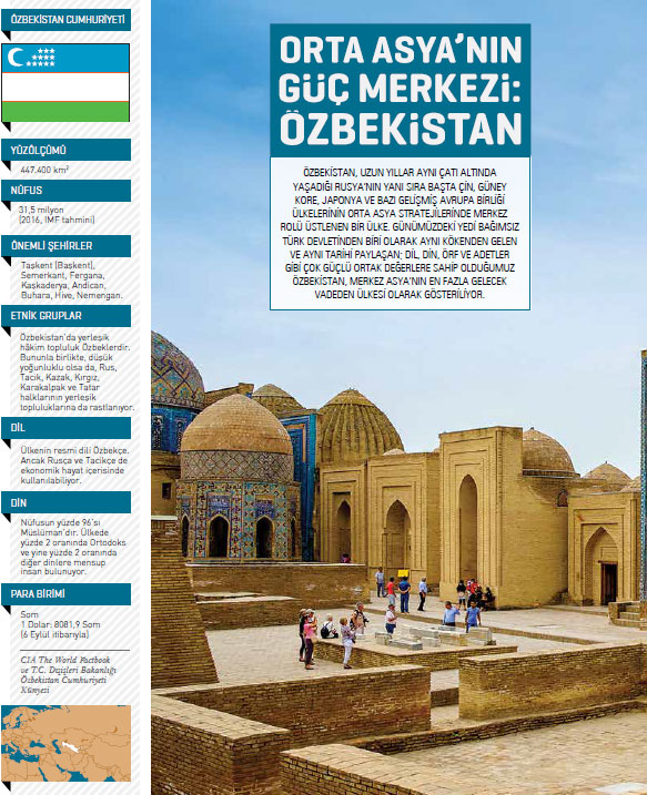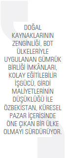 Mevcut merkezi ve stratejik konumuna ek olarak doğal kaynaklarının zenginliği, yüzde 1,5 gibi yüksek bir artış ivmesine sahip ülke nüfusu, Bağımsız Devletler Topluluğu (BDT) ülkeleriyle uygulanan gümrük birliği imkânları, kolay eğitilebilir işgücüne sahip oluşu, yatırım ve üretim için kullanılan başta enerji, ham madde ve işçilik olmak üzere girdi maliyetlerinin düşüklüğü, doymamış ve giderek büyümekte olan bir pazar olmasıyla Özbekistan, küresel pazar içerisinde öne çıkan bir ülke olmayı sürdürüyor.