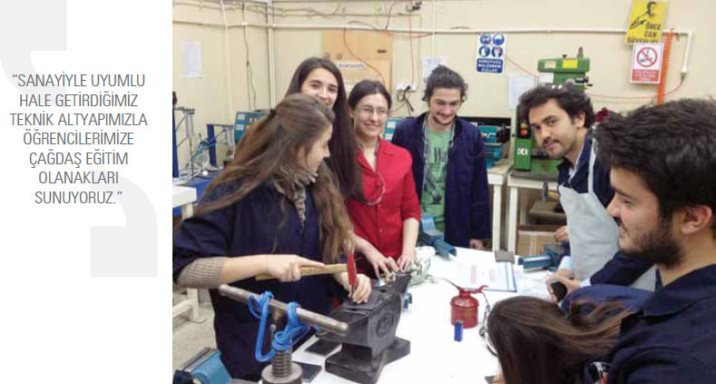Bölüm öğrencilerimizin eğitim niteliğinin artırılması için aralıksız çalışmayı sürdürüyoruz. Özellikle son sınıf öğrencilerimizin yıl içi ve bitirme projelerinde uygulamaya ağırlık vermelerini sağlayarak üretim sürecine dahil olmaları için çaba harcıyoruz. Proje bazlı çalışmalarında yapılan işi ve ürünü somut olarak görmelerini amaçlıyoruz. Öğrencilerimiz de farklı proje ekiplerinde görev alarak bölümlerinde edindikleri teorik bilgilerini uygulama imkanı buluyor. Örneğin öğrencilerimiz toz metalürjisi laboratuvarında farklı güçlendirici tozlar kullanarak malzemelerin aşınma dirençlerini artırıp bu malzemelerin içyapılarındaki değişimleri, malzeme laboratuvarındaki optik mikroskop ile inceleyebiliyor. Aynı laboratuvarda ürettikleri malzemenin sertlik gibi mekanik özelliklerini bulabiliyor. Ya da mekanizma tekniği dersinde almış olduğu teorik bilgiyle hidrolik ve pnömatik laboratuvarında farklı mekanizmalar yaratıp bunları simule edebiliyor. Bünyemizde bulunan üç eksenli CNC makineyle çeşitli formlarda parçalar üretip metal işleme sırasında karşılaşılan problemleri bire bir gözlemleyebiliyor. Ayrıca öğrencilerimiz CNC ve diğer konvansiyel makinelerle çeşitli plastik enjeksiyon kalıpları yapabiliyor ve bu kalıpları plastik enjeksiyon makinesine bağlayıp plastik üretimi yapabiliyor. Böylece plastik enjeksiyon teknolojisini de lisans eğitimi sırasında uygulamalı öğrenme şansı buluyor.