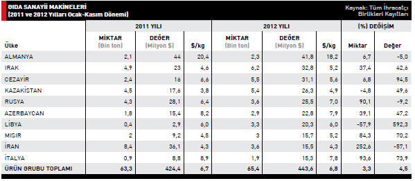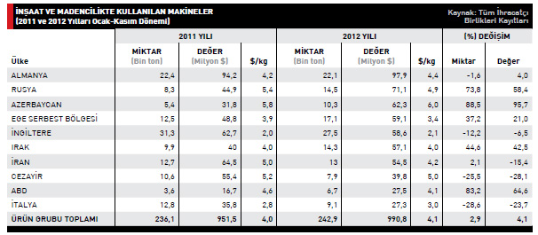değerinde ürünihraç edildi. Yüzde 4,1 artışın yaşandığı söz konusu sektörün 2011 yılının aynı döneminde ihraç ettiği ürünlerin tutarı 951,5 milyon dolardı.2012 yılı Ocak-Kasım döneminde,inşaat ve madencilikte kullanılan makineler, aksam ve parçaları sektöründeen fazla ihracat gerçekleştirilen ülke, bir önceki yıla göre yüzde 4 artışla Almanya oldu.