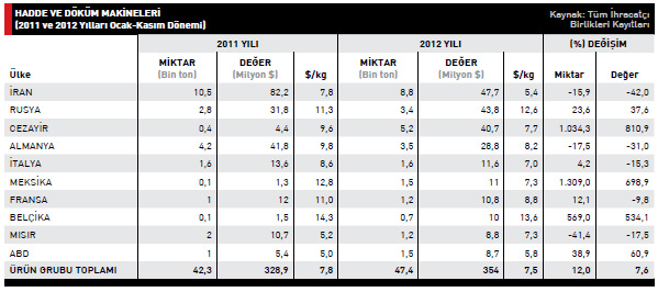 Hadde ve döküm makineleri, kalıplar,aksam ve parçaları sektöründe yaşanan ihracat artışı böylelikle 7,6 oldu. 2012 yılıOcak-Kasım döneminde en fazla ihracat gerçekleştirilen ülke 47,7 milyon dolarlaİran oldu. İran’dan sonra ikinci sırada ise Rusya yer aldı.