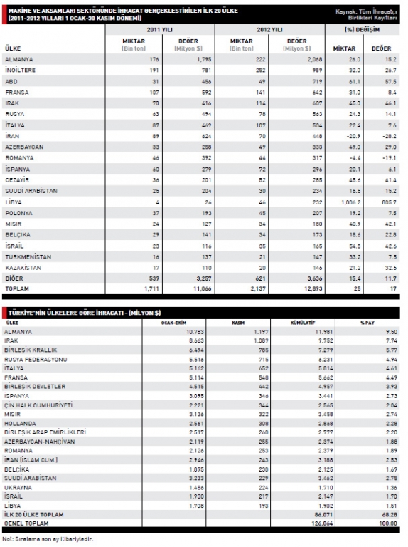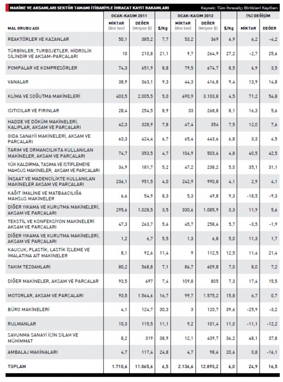 Makine ve aksamları ihracatı 2012 yılı Ocak-Kasım döneminde yüzde 16,5 artış kaydederek 12,8 milyar dolar seviyesine yükseldi. Türkiye’nin makine ihracatında ilk 10 ülke sıralamasında ise 2 milyar dolar ihracat değeriyle Almanya ilk sırada yer alıyor.