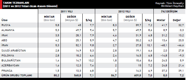 Rusya’ya 2011 yılının Ocak-Kasım döneminde 31,8 milyon dolarlık ihracat gerçekleştirirken bu rakam 2012 yılının aynı döneminde yüzde 37,6artışla 43,8 milyon dolara yükseldi. Listeninüçüncü sırasında bulunan Cezayir’e2012 yılının Ocak-Kasım döneminde birönceki yılın aynı dönemine göre yüzde810,9 artışla 43,8 milyon dolarlık ürün ihraç edildi.