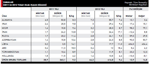 Vanalar sektörü ihracatı 2012 yılının Ocak-Kasımdöneminde, 2011 yılının aynı dönemine göre yüzde14,8 artarak 416,8 milyon