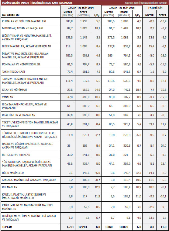 Makine sektöründe 2015 yılı Ocak- Ekim döneminde en fazla ihracat gerçekleştiren alt sektör klimalar ve soğutma makineleri oldu. 2015 yılı Ocak-Ekim döneminde söz konusu ürün grubunda gerçekleştirilen ihracat 1,6 milyar dolar olarak kaydedildi. Listenin ikinci sırasında bulunan motorlar, aksam ve parçaları kaleminde 2015 yılı Ocak-Ekim döneminde 1,4 milyar dolar değerinde ihracat gerçekleştirildi. 2015 yılı Ocak-Ekim dönemi itibariyle makine sektöründe en fazla ihracat gerçekleştiren üçüncü kalem ise 1 milyar dolarlık ihracat değeriyle diğer yıkama ve kurutma makineleri, aksam ve parçaları oldu.