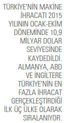 2015 yılı Ocak-Ekim döneminde Türkiye’nin makine ihracatı 10,9 milyar dolar olarak kaydedildi. 2015 yılı Ocak-Ekim dönemi rakamlarına göre Almanya, 1,7 milyar dolar rakamıyla makine sektöründe en fazla ihracat gerçekleştirilen ilk 10 ülke listesinin ilk sırasında yer alıyor. Listenin ikinci sıradaki ABD’ye yönelik makine ihracatı, 2015 yılı Ocak-Ekim döneminde 765 milyon dolar oldu. Türkiye’nin en fazla makine ihracatı gerçekleştirdiği ilk 10 ülke listesinin üçüncü sırasında ise İngiltere bulunuyor. İngiltere’ye yönelik makine ihracatımız 2015 yılı Ocak-Ekim döneminde 642 milyon dolar olarak kayda geçti.