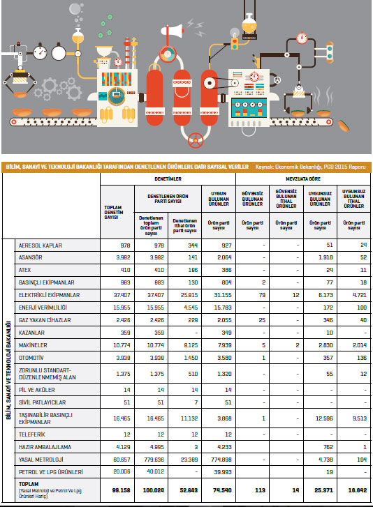 Bilim, Sanayi ve Teknoloji Bakanlığı verilerine göre makine sektöründeki ürünlerin üçte biri ne yazık ki mevzuata uygun değil, hatta sorunlu… Bu rakamın içine bütün sanayi ürünleri dâhilken aynı derecelendirmede asansör sektöründeki uygunsuzluk yüzde 60’a kadar çıkıyor. Benzer şekilde, elektrikli ev aletlerinde de uygunsuzluk rakamlarının yüksek seyrettiğini dile getirmeliyiz.