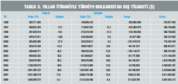 Türkiye’nin Bulgaristan’ın toplam dış ticaretindeki payı da sürekli artmıştır. Diğer taraftan, 2006-2008 yılları arasında Türkiye Bulgaristan’ın en büyük ihracat pazarı olma unvanını korudu. Bu dönem içinde Bulgaristan toplam ihracatının yüzde 10’dan fazlasını Türkiye’ye yaptı. Ayrıca bu dönem boyunca iki ülkenin karşılıklı ticareti sürekli dengede oldu. Ancak, uluslararası mali krizin etkisiyle 2008 yılında iki ülke arasındaki toplam ticaret hacmi bir önceki yıla göre yüzde 10 azaldı. Bulgaristan Merkez Bankası’nın 2008 verilerine göre Türkiye ile Bulgaristan arasındaki toplam ticaret hacmi 2,753 milyon euro olarak gerçekleşti. Bu dönemde Türkiye’nin Bulgaristan’a ihracatı 1,402 milyon euro, Bulgaristan’dan ithalatı ise 1,351 milyon euro olarak gerçekleşti. Örneğin, 2002-2007 yılları arasında Türkiye-Bulgaristan toplam ticaret hacmi yıllık ortalama yüzde 26 gibi yüksek bir oranda arttı, 888,7 milyon dolardan 3 milyar 991 milyon dolara ulaştı. Aynı dönemde Türkiye’nin Bulgaristan’a ihracatı yüzde 274 artarak 380 milyon Dolar’dan 2 milyar 151 milyon dolara yükseldi.