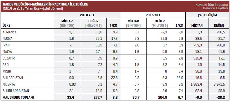 Hadde ve döküm makineleri mal grubunda 2015 yılının Ocak-Eylül döneminde 24,3 milyon dolarla en fazla Almanya’ya ihracat gerçekleştirildi. Listenin ikinci sırasında yer alan Rusya’ya 2015 yılının Ocak-Eylül döneminde 22,8 milyon dolarlık ihracat gerçekleştirildi. Üçüncü sıradaki İran’a 2015 yılının Ocak-Eylül döneminde 17 milyon dolar değerinde ürün ihraç edildi. Dördüncü sırada bulunan İtalya’ya 2015 yılının Ocak-Eylül döneminde 9,9 milyon dolar değerinde ürün ihraç edildi. Listenin beşinci sırasındaki Cezayir’e 2014 yılının Ocak-Eylül döneminde 7,2 milyon dolar değerinde hadde ve döküm makineleri ihraç edilirken 2015 yılının aynı döneminde bu rakam yüzde 17,1 artışla 8,5 milyon dolar oldu.