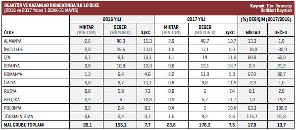 Reaktör ve kazanlar ihracatı 2016 yılının Ocak-Mayıs döneminde 155,1 milyon dolarken 2017 yılının aynı döneminde bu rakam yüzde 13,7 artışla 176,3 milyon dolar oldu.